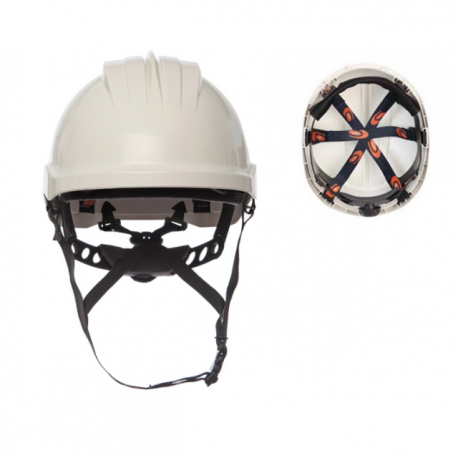 Capacete em ABS; Características: - 10 orifícios de ventilação; - Arnês injetado a polietileno com 6 pontos de fixação (54 - 61 cm); - Banda de suor; - Tiras têxteis em poliéster na zona da nuca; - Arnês com ajuste manual através de roda dentada; - Oferece proteção contra salpicos de metal fundido; - Fitas refletoras disponíveis (não incluídas); - Projetado para ser usado especialmente para trabalhos em altura; - Peso: 396 gr;