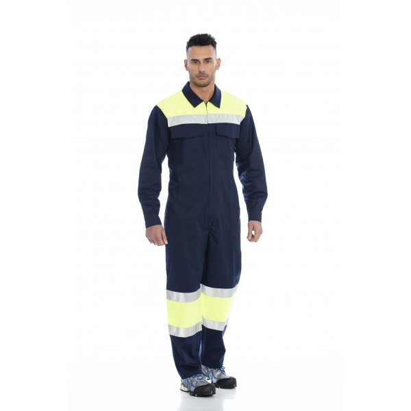 Fato macaco em sarja poliéster-algodão alta visibilidade c/fitas refletoras.