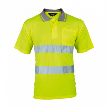Polo de alta visibilidade, 1 bolso superior, gola com 3 botões, 2 faixas de alta visibilidade
