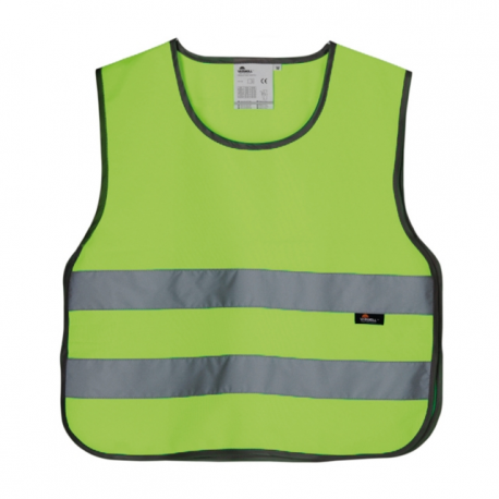 Tabardo de alta visibilidade para criança, 100% Poliéster, bandas reflectoras frente e costas, ajuste lateral com velcro.