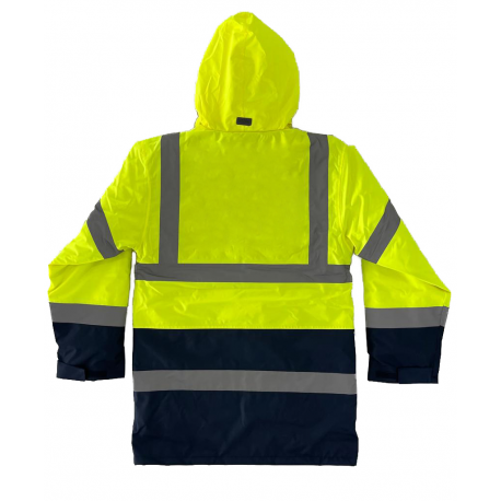 Parka de alta visibilidade - 100% poliéster 300D Oxford revestido a poliuretano - ZIP recoberto com aperto por molas - Elástico ajustável nas costas - Capuz oculto - Fitas refletoras