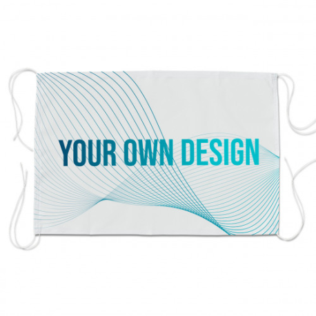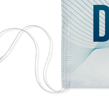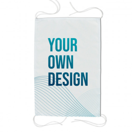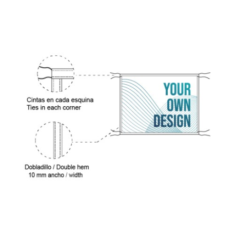 Banner rectangular em tecido de poliéster ou tecido impermeável. Tem uma corda dupla de cerca de 10 cm nos quatro cantos para facilitar o nó. Concebida para ser feita na horizontal, pode ser personalizada na vertical, seleccionando a largura e a altura de acordo com as medidas de que necessita. A superfície têxtil do banner pode ser impressa com cores e/ou desenhos à sua escolha.