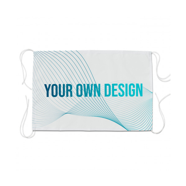 Banner, em tecido 100% poliéster 115 g/m², ou tecido impermeável 180 g/m². Tem duas fitas ou cordões em cada canto para atar.