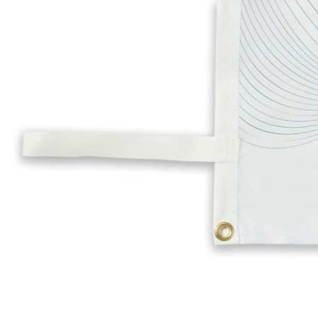 No sleeve at the top. Reinforced strip, 2 eyelets and ties to go around the flagpole on the left-hand side (flagpole not included).