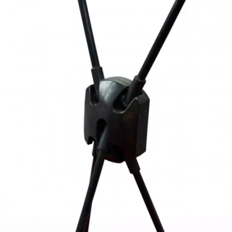 O suporte é composto por cinco hastes pretas de fibra de carbono unidas por uma peça central que funciona como dobradiça.