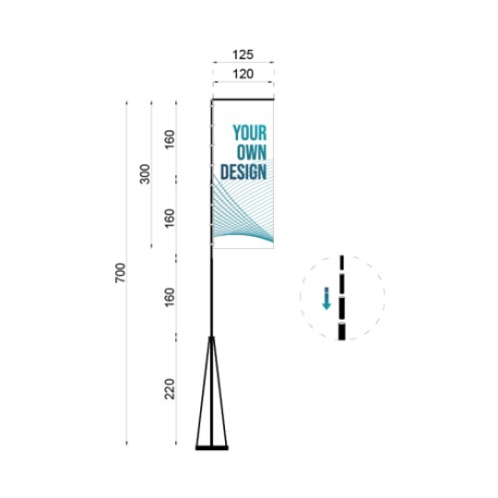 Os nossos mastros telescópicos extensíveis para banners são adequados para banners verticais. Dispõem de um braço elétrico que segura a faixa publicitária desenrolada.