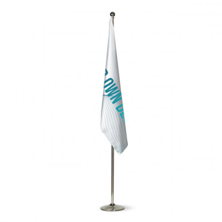 Pacote completo constituído por uma bandeira de escritório retangular, feita na horizontal, com as dimensões à sua escolha. Tem cordas do lado esquerdo para a prender ao mastro. O pack foi especialmente concebido para completar a decoração de escritórios e outros espaços interiores.