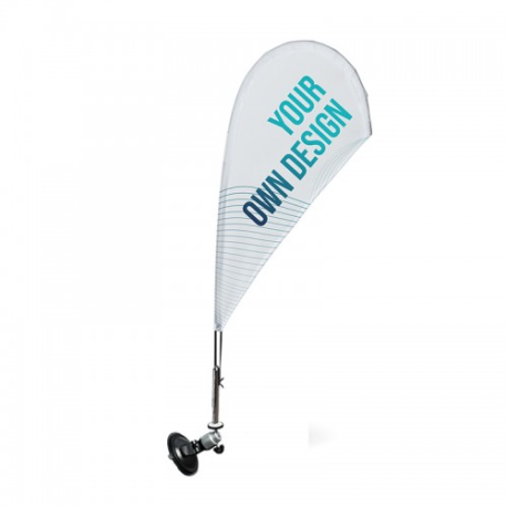Pack completo de Mini Fly Banner Gota com base de ventosa para carro, que inclui todos os elementos necessários para a sua instalação: