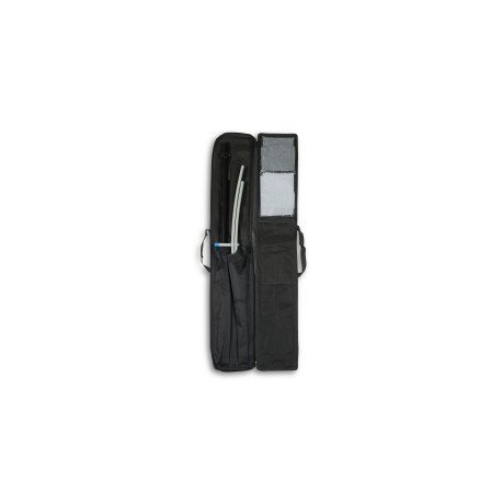 Estojo de transporte e proteção para todos os componentes dos packs completos Fly Banners em preto. Possui compartimentos internos, fecho de correr e bolso exterior transparente para uma fácil catalogação e identificação do conteúdo. Quer guarde as suas Fly Banners, bases e postes num armazém ou as transporte para eventos, esta mala mantém-nas protegidas do pó, humidade e danos.