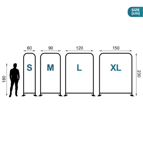Disponível em quatro tamanhos. Com largura entre 60 e 150 cm, e altura fixa de 230 cm, para que possa escolher o que melhor se adapta às necessidades do seu cliente.