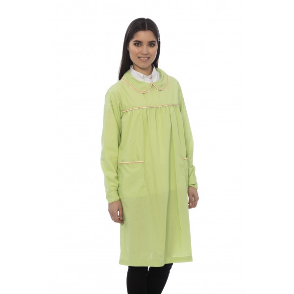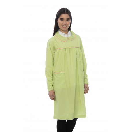 Bata senhora em sarja poliéster-algodão de manga comprida.