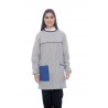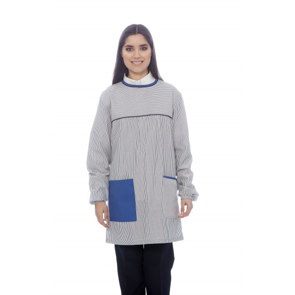 Bata senhora em sarja poliéster-algodão de manga comprida.