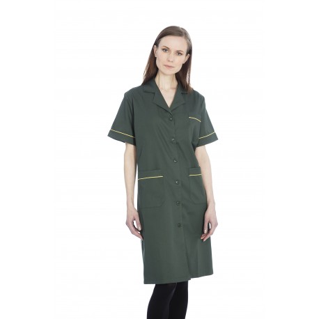 Bata senhora em sarja poliéster-algodão de manga comprida.