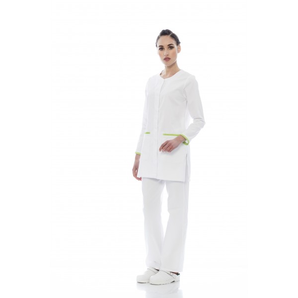 Bata senhora em sarja poliéster-algodão com folhos