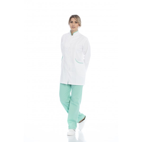 Bata senhora em sarja poliéster-algodão de manga comprida.