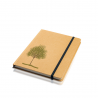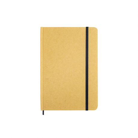 Bloco notas em cartão reciclado. Tamanho A6, 96 folhas lisas de 80 gramas, com elástico e marcador coloridos. Ideal para personalização.