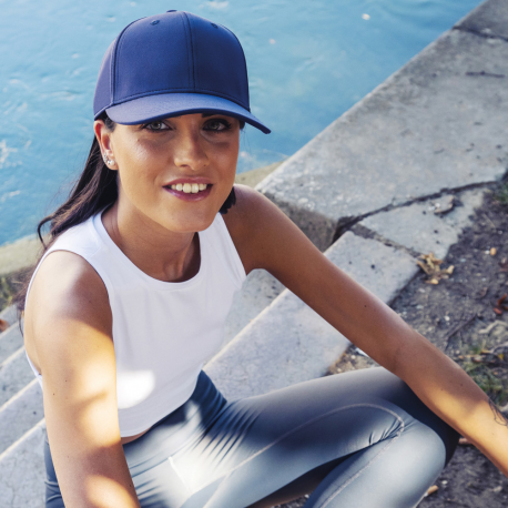 Boné estruturado de 6 painéis, produzido com poliéster tingido por transferência quente, sem imersão em água. Costuras completas, viseira semi-curva e 6 ilhoses. Fecho em velcro de alta qualidade. 100% Poliéster Reciclado certificado
