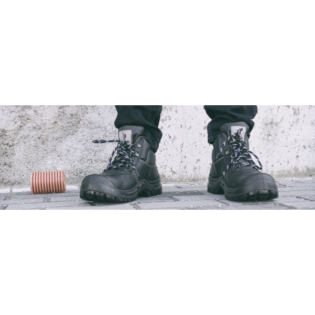 S3 SRC MATERIAL: Pele pigmentada hidrófuga, ilhoses metálicos; FORRO: Malha tridimensional (cambrella), que proporciona uma melhor fluidez do calor no interior do calçado; Costuras posicionadas simetricamente para garantir uma estrutura fixa e resistente; Reforço anti abrasão em poliuretano na zona do calcanhar; PALMILHA INTERIOR: Amovível em eva, perfurada e forrada a tecido, com absorção de choque na zona do calcanhar; Antiestática; SOLA: Poliuretano de dupla densidade resistente a hidrocarbonetos e antideslizante; BIQUEIRA: Aço resistente a impactos até 200J; PALMILHA: Aço resistente a 1100N;