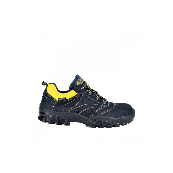 Sapato em camurça perfurado S1P; Biqueira em aço com resistência ao impacto a 200J; Palmilha anti perfuração em aço resistente a 1100N (P)