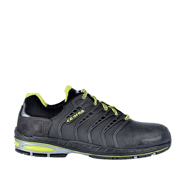 Sapato em Nubuck preto hidrófuga S3; Biqueira em alumínio com resistência ao impacto a 200J; Palmilha anti perfuração não metálica APT Plate resistente a 1100N (P); Palmilha interior COFRA SOFT, anatómica em poliuretano perfurado, suave e confortável. Garante a absorção de energia ao impacto e absorva o suor deixando o pé seco; Forro em tecido transpirável, antibacteriano e anti abrasão; Sola em poliuretano/TPU resistente a hidrocarbonetos (FO); Anti estática (A); Absorção de energia no tacão (E); Pele resistente à penetração da água (WRU); Resistente ao deslizamento (SRC).