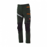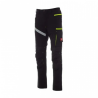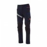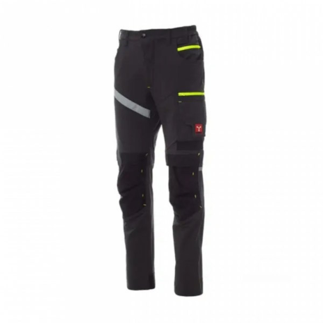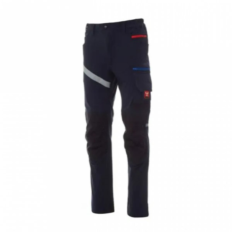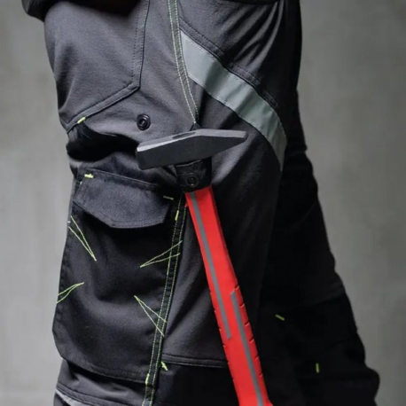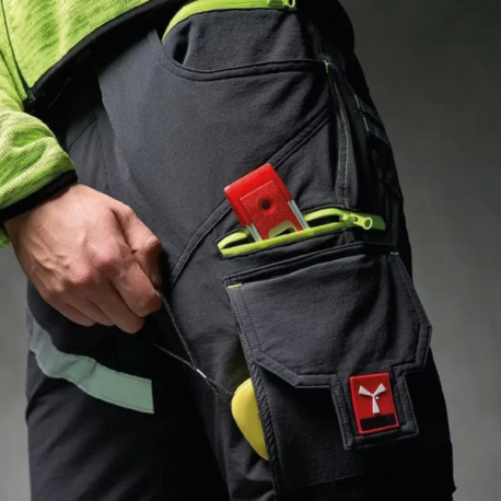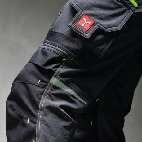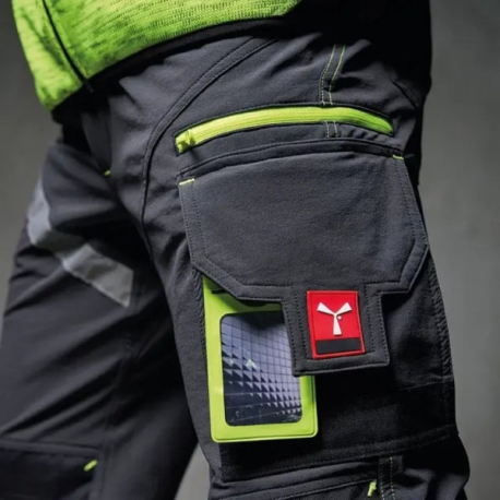 - Na parte de trás: um bolso de paleta com fecho de velcro e um bolso sem paleta mas com 2 bandas refletoras, um passador porta-martelo (perna direita), um bolso aberto para uma fita métrica (perna direita) e um bolso para telefone com paleta e velcro (perna direita), inserções refletoras à altura do joelho (em ambas as pernas), fitas para-lamas em tecido contrastante (ambas as pernas);