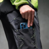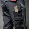 - Na parte da frente da perna esquerda tem 3 bolsos: um bolso horizontal com fecho de correr, um bolso com paleta perfilada com fecho de velcro e um porta- crachá, um pequeno bolso vertical com fecho de correr; Na parte da frente da perna direita existe uma banda refletora; Ambas as pernas têm bolso para joelheiras com abertura superior;