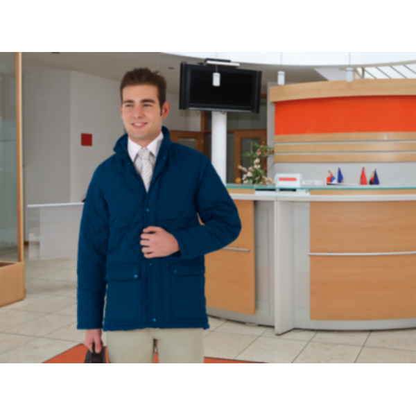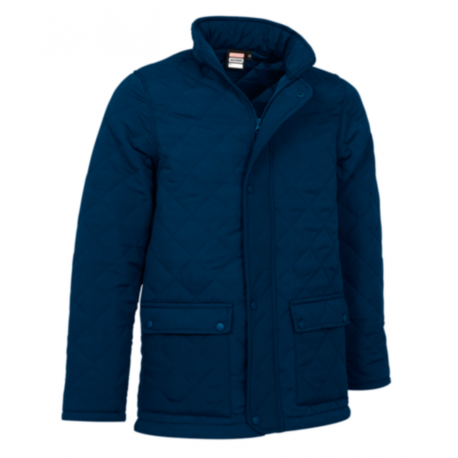 Tecido sandwich losangos corta-ventos 100% poliéster 425 grs/m2. Gola alta. Fecho dianteiro debaixo carcela com botões a pressão. 2 bolsos com tapa e botões a pressão.Caixa 10 unidades: 1 tamanho. Bolsas individuais.