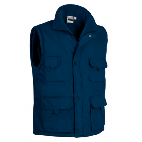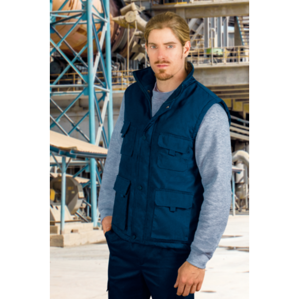 Colete em sarja de 200g, fecho de correr frontal, 9 bolsos na frente e dois bolsos nas costas.