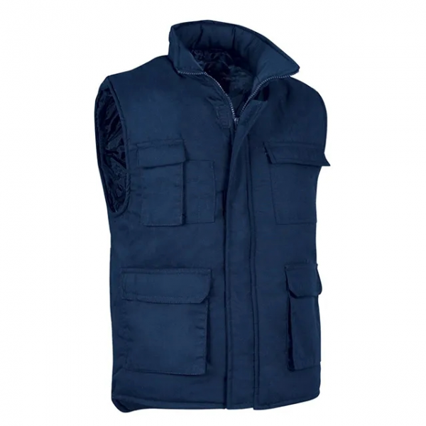 Colete poliéster/Algodão acolchoado, multibolsos, sistemas de aperto com fecho e molas de pressão, 2 bolsos duplos em baixo, 2 bolsos centrais e 2 bolsos no peito