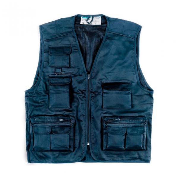 Colete em sarja de 200g, fecho de correr frontal, 9 bolsos na frente e dois bolsos nas costas.