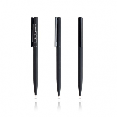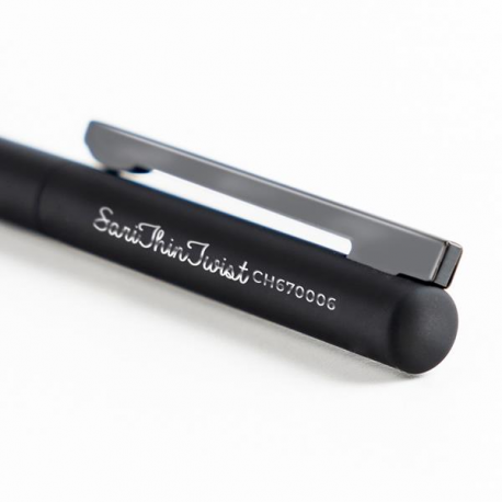 Solução Moderna, Elegante e Consciente, esta esferográfica fina Sari Thin Twist é concebida da combinação de três materiais premium - latão, aço inoxidável reciclado e ABS