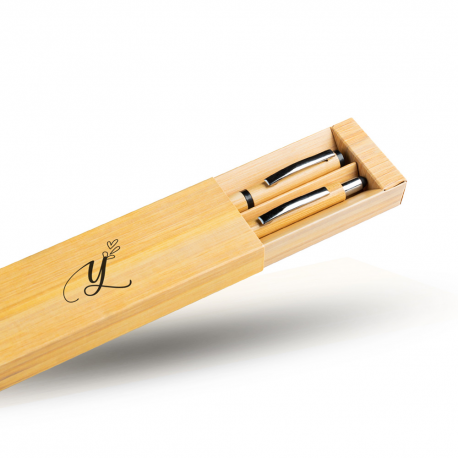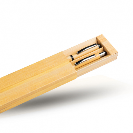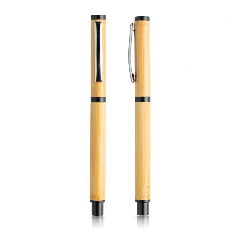 Conjunto de esferográfica e roller em bambu, estojo de oferta. Ligado à natureza surge um conjunto de esferográfica e roller, ambas com corpo em bambu. A esferográfica inclui um stylus cuja cor combina com o fundo da roller. Ambas as peças apresentam um clip prateado. O conjunto é de escrita azul. Esferográfica com sistema pulsar e roller com sistema tampa. Inclui estojo em cartão, formato manga deslizante.