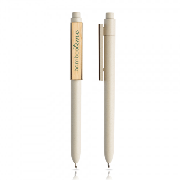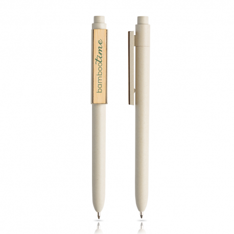 Esferográfica em PP e fibra de bambu, clip em bambu. Ligada à ideia de eco-frielndly, esta esferográfica que concilia a fibra de bambu e o bambu numa esferográfica de clip perfeito para personalizar a laser. A esferográfica é de escrita azul, com sistema pulsar.
