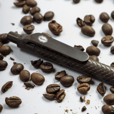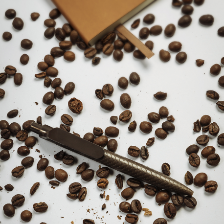 Esferográfica em ABS e fibra de café, Khaffee. O seu corpo destaca esta esferográfica de todas as outras, pelo seu relevo diferente. Sistema pulsar e escrita preta. Esta esferográfica é um brinde único, com um ótimo clip personalizável. Material eco-friendly.