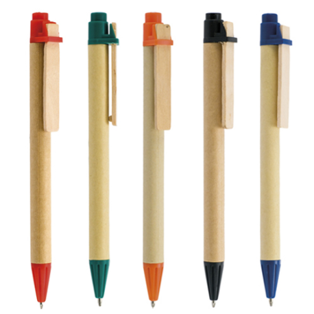 Esferográfica de cartão reciclado, clip de madeira. Escrita preta, sistema pulsar. Esferográfica com corpo em cartão reciclado, clip em madeira clara, topo e ponta em plástico colorido. Com este brinde pode associar a sua marca ao movimento ecológico. Escolha reciclado, salve o planeta!