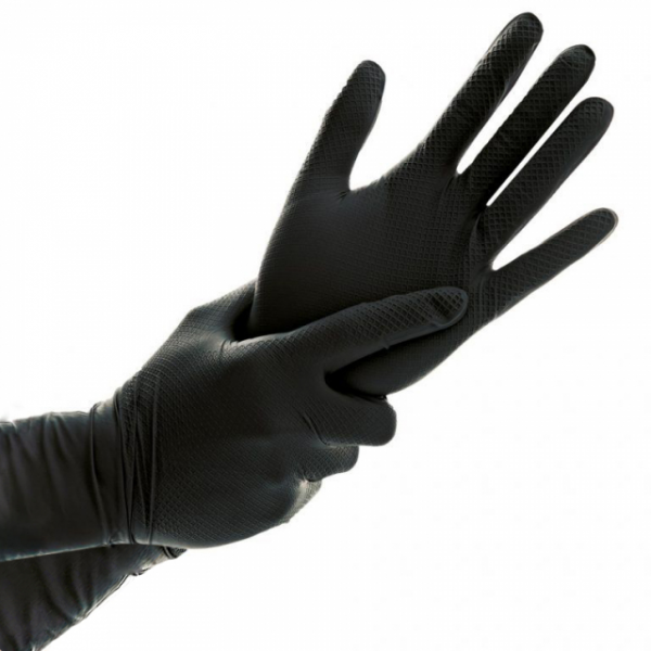 COMPOSIÇÃO: - Nitrilo preto sem pó; CARACTERÍSTICAS: - Uso único; - Ambidestras; - Punho enrolado; - Texturada em escama; - Evita os riscos de alergia ao látex; - AQL<1,5; COMPRIMENTO: - 295 mm; ESPESSURA: - 0,30 mm de espessura; PESO: - 9,5gr; RECOMENDADA PARA: - Montagens, pinturas em spray, indústria automóvel, serviços de limpeza, agricultura/horticultura;