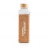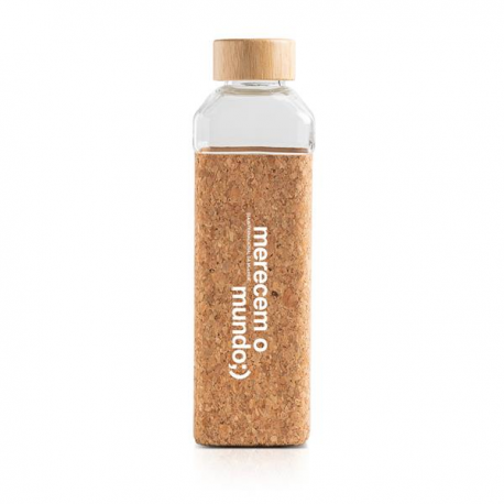 Garrafa em vidro com manga em cortiça. Uma garrafa de 640ml com um formato diferente do comum. Com tampa em bambu e uma manga em cortiça, que lhe conferem maior elegância e um ar mais natural e eco-friendly.