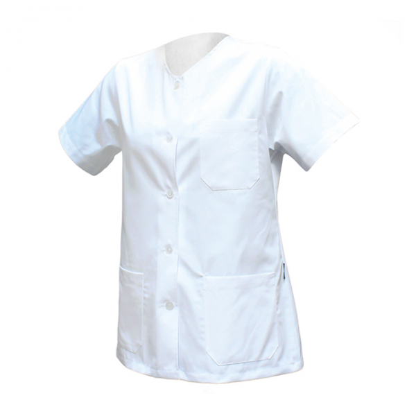 Jaleca modelo sem gola manga curta - 65% poliéster e 35% algodão; - Gramagem: 200g/m2; - Aperto frontal por botão; - 3 bolsos;