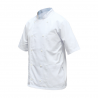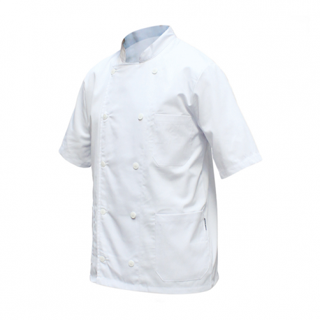 Jaleca modelo cozinheiro manga curta - 65% poliéster e 35% algodão; - Gramagem: 200g/m2; - Aperto frontal por botão; - 3 bolsos;
