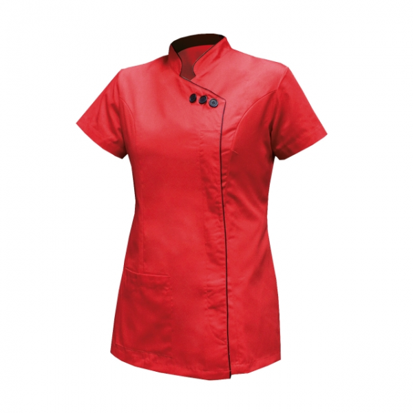 Jaleca manga curta - 65% poliéster e 35% algodão; - Gramagem: 200g/m2; - Aperto frontal / lateral por botão com carcela recoberta; - Bolso inferior; - Aplicação de vivo em contraste; - Modelo cintado;