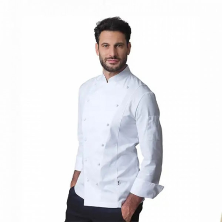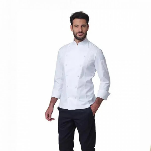 - Jaleca de chef de primeira linha com corte elegante e modelado.