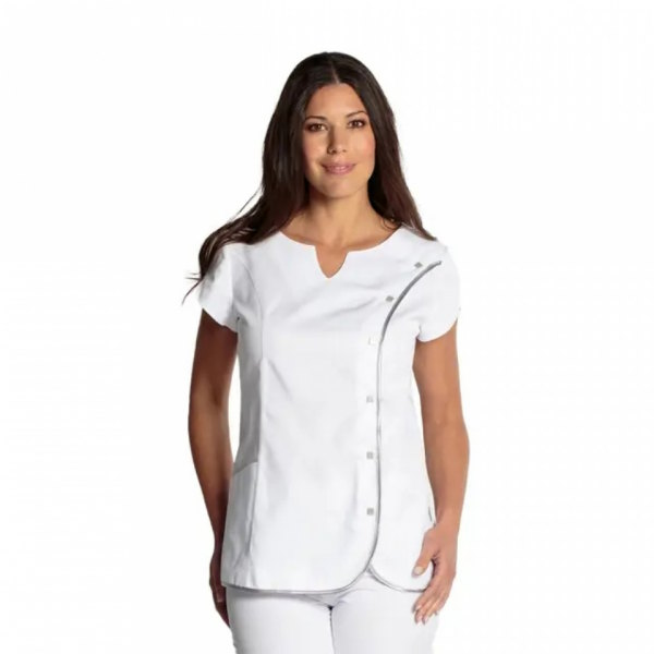 Jaleca sanitária de manga curta. - Com gola mandarim e recortes laterais na parte inferior da peça.