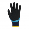- Suporte em poliéster azul e spandex preto revestida a nitrilo foam arenoso preto na palma e pontas dos dedos sobre nitrilo azul 3/4;