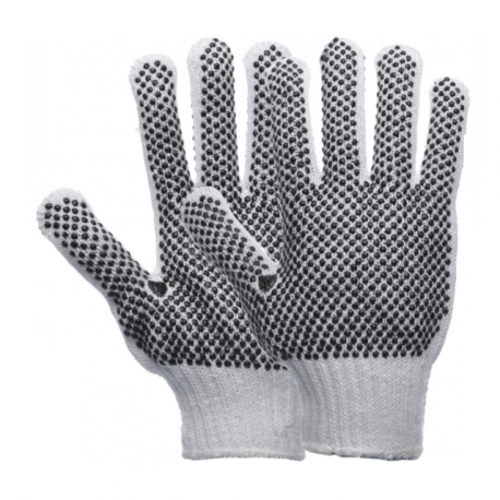 Composição: - Algodão e poliéster branco revestida a micro-pontos em PVC Características: - Suporte sem costuras - Pontos em PVC na palma e dedos, que proporcionam maior aderência e proteção - Poliéster exterior resistente a um grande nível de abrasão - Antialérgica - Arejada - Punho elástico - Ambidestrais Galga: - 7 Recomendada para: - Indústria automóvel; Limpeza; Logística