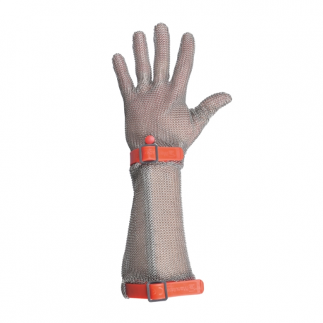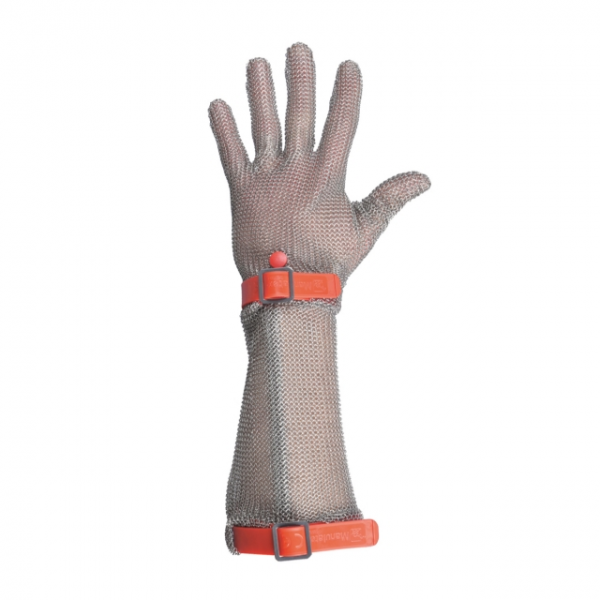 COMPOSIÇÃO: - Malha metálica em aço inoxidável; CARACTERÍSTICAS: - Ajustável por pulseira de polietileno com mola de pressão; - Proteção completa do pulso; - Ambidestra; COMPRIMENTO: - 32,6 cm; ESPESSURA: - 0,50 mm; RECOMENDADA PARA: - Indústria alimentar; Matadouros;