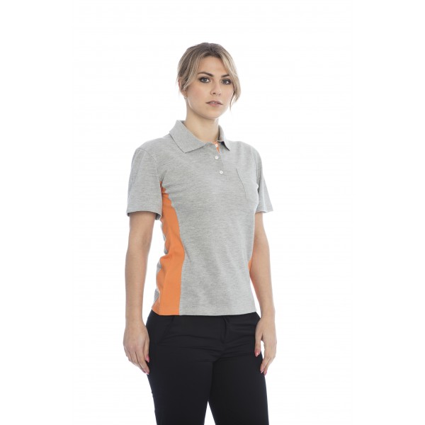 Polo senhora em malha piquet poliéster-algodão c/ contraste.