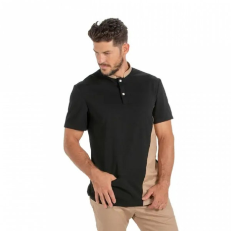 - Pólo preto de homem em tecido antibacteriano de iões de prata na frente e malha cooldry nas costas.