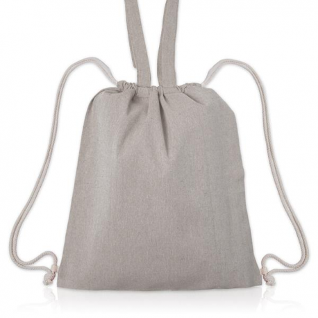 Saco mochila, asas longas em algodão reciclado 140g/m². Um brinde versátil, pois inclui alças de cordão para usar como mochila e asas compridas para usar como saco. Feito em material reciclado e ecológico.