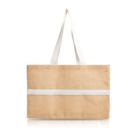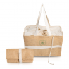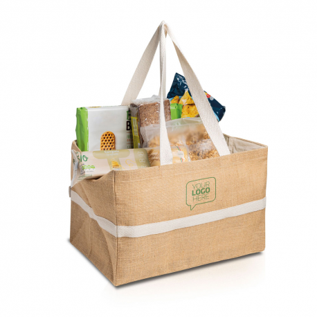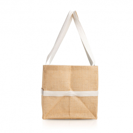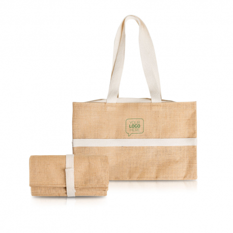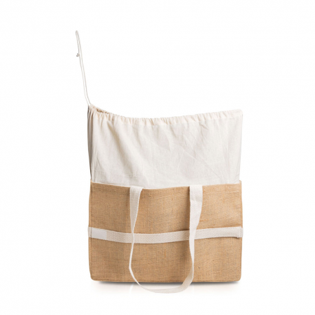Saco em juta dobrável e extensível. Este original saco de juta e algodão é dobrável para que o possa transportar com maior facilidade e tem uma zona extensível em algodão facilmente personalizável e que permite transportar um maior volume de compras.