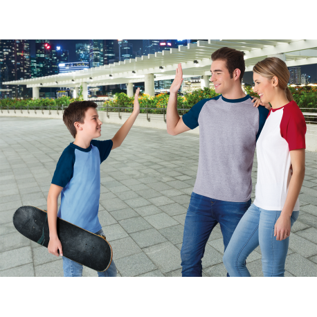 Dupla costura na gola, bainha e mangas.
